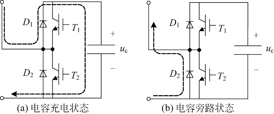 启动初始时刻,子模块控制保护单元并无工作电压,IGBT脉冲均处于封锁状态,系统开始不可控充电过程。此阶段的响应过程是系统拓扑结构决定的,此时,子模块的工作状态由流经子模块的桥臂电流方向唯一决定,如图3所示,图中带箭头虚线表示桥臂电流流通路径。