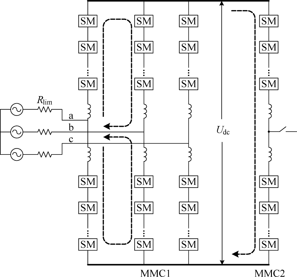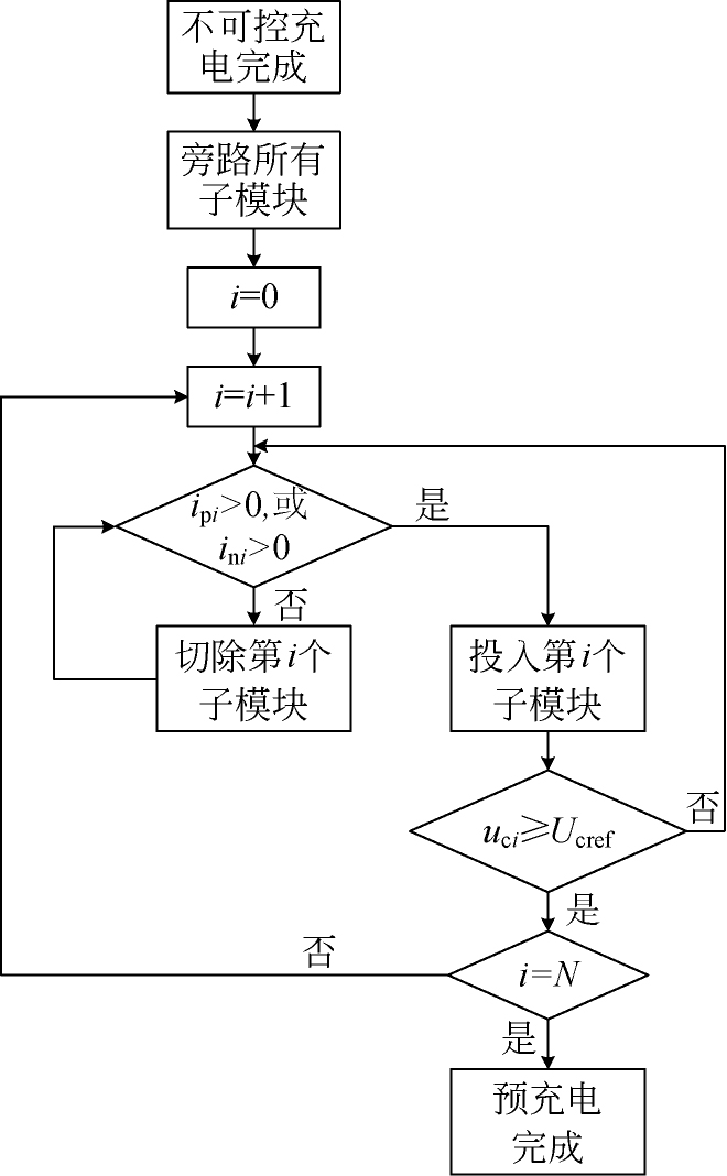 目前,对MMC的研究重点主要集中在系统层级的控制器与控制方法设计方面[4,5,6,7,8,9],在研究系统的稳态运行时通常认为系统已经具备一定的初始电压[10],对MMC的预充电启动过程的研究则相对较少[10,11,12,13,14]。与传统两电平变换器不同,MMC包含大量悬浮的子模块电容,初始时刻,所有子模块电容均无初始电压;在进入稳定运行工作状态以前,需要采取相应的控制策略先对子模块电容进行充电,将子模块电容充电至稳态运行电压。MMC的预充电启动过程是系统稳态运行的基础,研究该过程具有十分重要的意义。