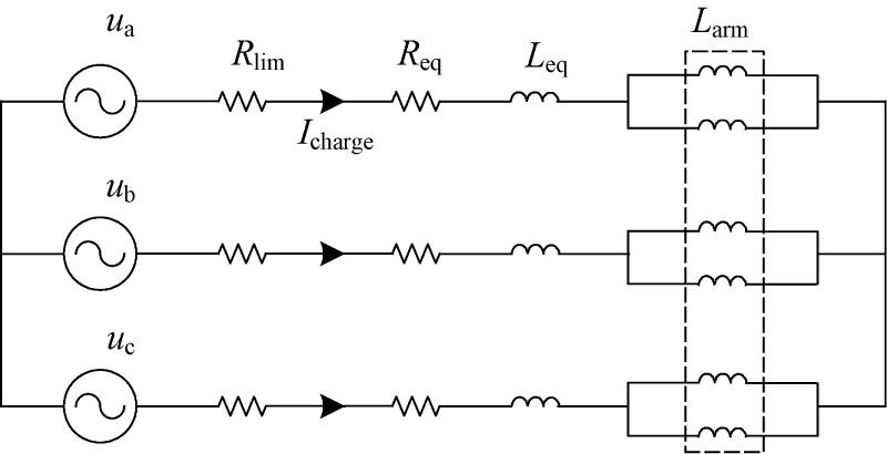 如图4所示,为了避免预充电过程中出现过大的充电电流,需要在充电回路上加装限流电阻。根据文献[15]的分析,预充电过程中的最大充电电流出现不可控充电开始的瞬间,此时,所有子模块电容均未被充电,直流母线电压为0,直流母线近似为短路,变换器的充电回路可等效为图5。