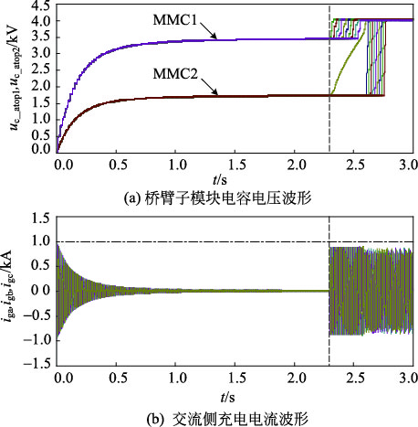 待所有子模块电容电压均被充电至不可控预充电过程的稳态值后,系统进入可控预充电阶段。由图中虚线以后的仿真波形可以看出,在可控预充电阶段,桥臂中子模块电容电压被逐个抬升至其稳态参考值4 kV,之后即被旁路,电容电压保持不变。