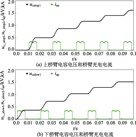 图中蓝色曲线为不可控预充电过程中变换器MMC1的a相单元中上下桥臂子模块电容电压,绿色曲线表示相同工况下三相全桥不可控整流器的桥臂电流波形。对比仿真波形可知,MMC1中桥臂子模块电容电压均是在相应桥臂流过充电电流的时间段被抬升,而在其他时刻电容电压则保持不变,验证了前文的理论分析结论。