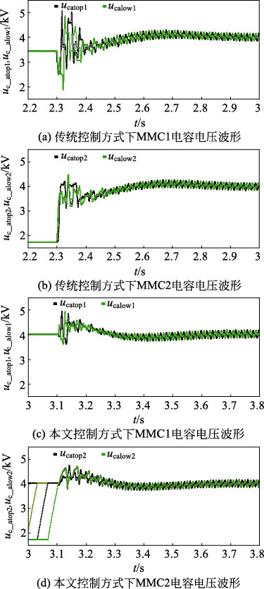 为验证本文解锁控制方案的平滑性,将本文所述方案与在不可控充电后直接引入双闭环的控制方法[16]进行了对比仿真研究,仿真结果如图10所示。图10中子图(a)(b)和(c)(d)所示分别为直接引入双闭环控制和本文第2节所述解锁控制策略的仿真结果。对比2种控制策略的仿真结果可知,若直接采用双闭环控制,在变换器由预充电转正常运行时,子模块电容电压会出现较大波动,过大的电压波动会增加对子模块电容的冲击,缩短电容器使用寿命;而在本文所述的解锁策略控制下,由于子模块电容电压已经预先被充电至稳态运行电压,变换器由预充电转至正常运行时子模块电容电压波动幅值显著降低,工作状态的切换过程更为平滑,电压波动对电容器造成的冲击明显减小,有利于延长子模块电容器的使用寿命。