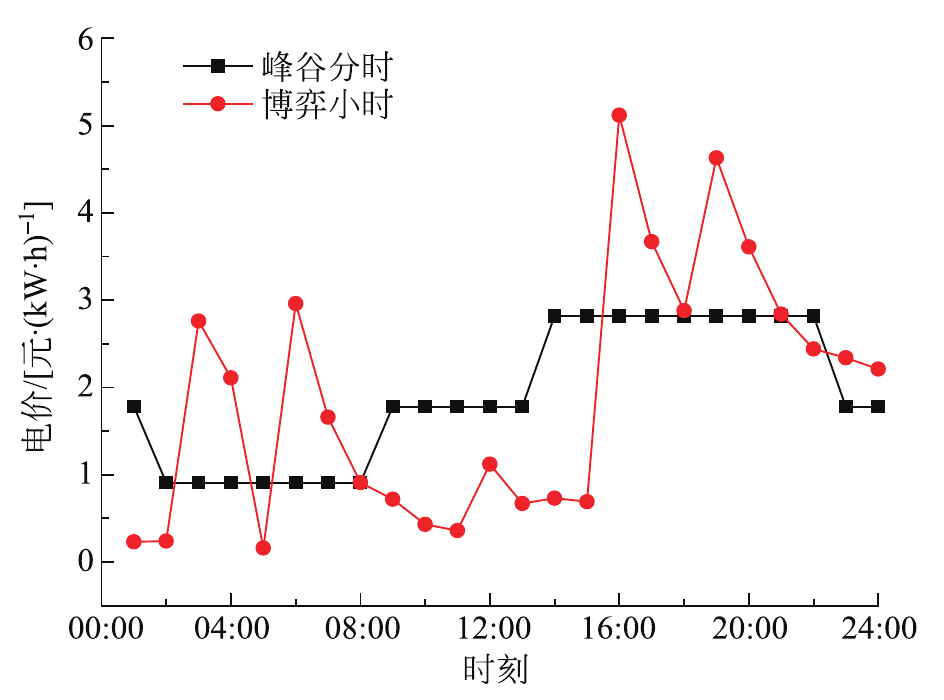 本文分别采用传统峰谷分时电价和博弈优化电价2种策略进行对比分析,给定峰平谷三阶段电价分别为2.82,1.78,0.91元/(kW·h),相应划分时段则分别13:00—22:00;08:00—13:00,22:00—01:00;01:00—08:00。经优化后结果如表1所示,相比于博弈电价优化策略,采用传统峰谷电价时,VPP内部发电侧收益略高,为986.72元,但同时会使用户在给定电价条件下为保证效用函数最大化而过于增大其可中断负荷比例,严重降低了用电舒适度,进而造成不便。经博弈优化后的用户实际负荷曲线及分时电价曲线分别如图5、图6所示。不难看出,优化后的负荷曲线较原始需求负荷曲线来说更贴近可再生能源出力曲线,而且灵活的新型分时电价策略不会因某些时段价格过高过于固定而使用户因被迫断电失去舒适度。