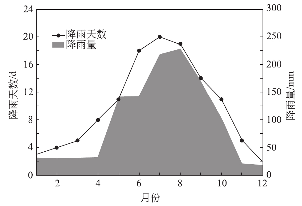 大理地区具有低纬度高原季风气候特性,四季气候差异不明显,温差较小。11月到次年4月较为干燥,降水量较少,仅占全年的5%~15%,5—10为雨季,降水量达全年的85%~95%。因此,选取2016年1—5月份开展组件积灰测试研究,6—10月开展雨水冲刷对组件输出功率影响检测。图1为meteonorm软件提供的大理地区多年平均月降雨天数和降雨量数据图。
