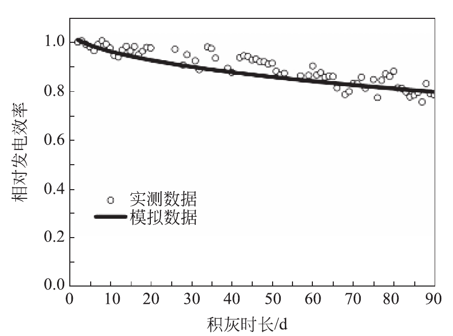 文献[10]通过研究灰尘对组件接收太阳辐照强度的影响,提出了相对透过率与积灰时长之间的拟合公式。组件表面积灰密度与其输出功率下降存在着必然的联系,透过率的下降导致了组件输出功率的下降,积灰越多,相同条件下组件的输出功率越低[11,12]。因此,本文使用相对透过率与积灰时长之间的关系式来拟合组件积灰后输出功率的变化情况,表达式为