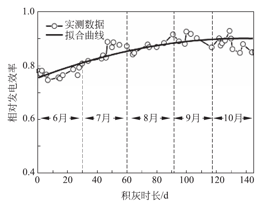(1) 使用Adel A Hegazy提出的拟合公式能够很好的拟合大理地区光伏组件相对发电效率随积灰时长的变化情况。1—5月中,各月灰尘沉积情况基本相同,光伏组件相对发电效率的衰减值近似,各月灰尘引起的组件发电效率下降为11.4%~13.3%。较长时间的组件积灰研究显示,组件相对发电效率的衰减呈现出先增大后逐渐减小的趋势,长期的积灰对光伏组件输出功率的影响明显。本文所获得的拟合公式对于预测大理地区积灰对光伏组件输出功率的影响具有一定的参考价值。