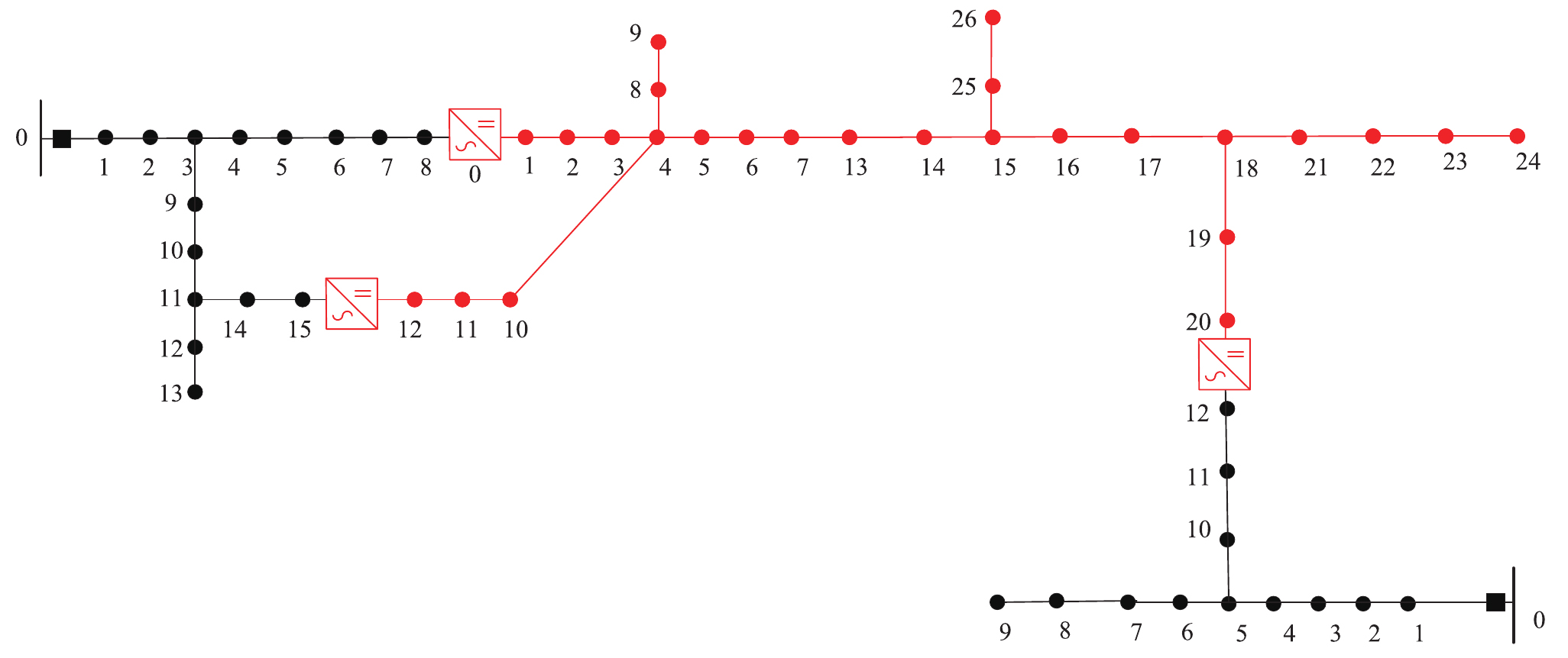 (1)网络拓扑分析,将整个配电网分为若干个交流子系统、直流子系统。