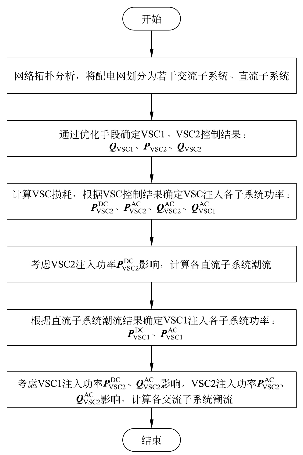 在进行交直流混合配电网的潮流计算时,对于直流子系统而言,可将采用V-Q控制方式的VSC1等效为一个恒定直流电压源,将采用P-Q控制方式的VSC2等效为一个恒功率型直流负荷;对于交流子系统而言,可将采用V-Q控制方式的VSC1、采用P-Q控制方式的VSC2均等效为一个恒功率型交流负荷。通过这种方式,可以实现交直流系统的解耦,即交流潮流和直流潮流的分开求解。图5所示为交直流混合配电网潮流求解算法流程图,具体步骤如下。