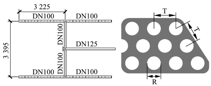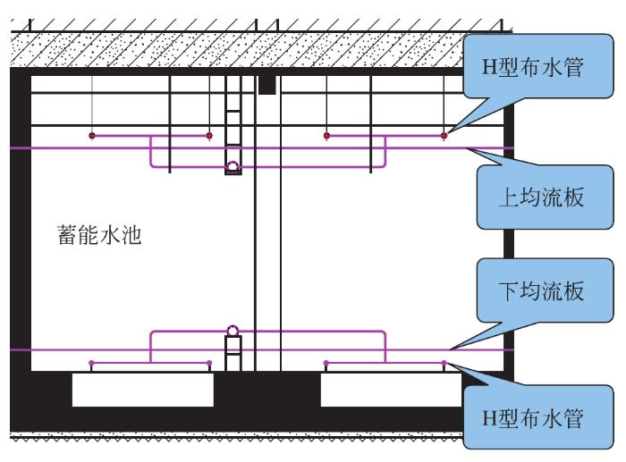 需要在水槽内设置高效布水器(又称稳流器)来控制蓄冷槽的内部流动,保证斜温层稳定且厚度尽可能薄。自然分层型布水器的类型主要有八角型布水器、辐射圆盘型布水器、H型布水器、多孔板(均流板/筛漏板)式布水器,本项目采用H型布水器结合均流板的布水器形式,罐内设置上下共2套精密面布水器,均流板分别敷设于上布水器的下方和下布水器的上方,具体布水装置布置形式如下图2所示,布水器经过多次布水分流后进入布水管道,将水流均布于蓄冷水罐水平面,经过布水器上数万个开孔形成活塞流,水体内部扰动被约束至极小的程度。通过合理控制布水器的出口流速以及弗劳德数(Fr)和雷诺数(Re)的设计指标,可确保超薄的斜温层厚度和自然分层布水效果并获得优异的布水器性能。第二级精密面布水均流板上以孔间距5 mm左右60°错位开直径2.5 mm的圆孔,合理布置,有效控制通过孔的流速低于0.006 m/s,起到很好的整流作用。本项目所采用的H型布水器及第二级精密面布水均流板结构如图3所示。