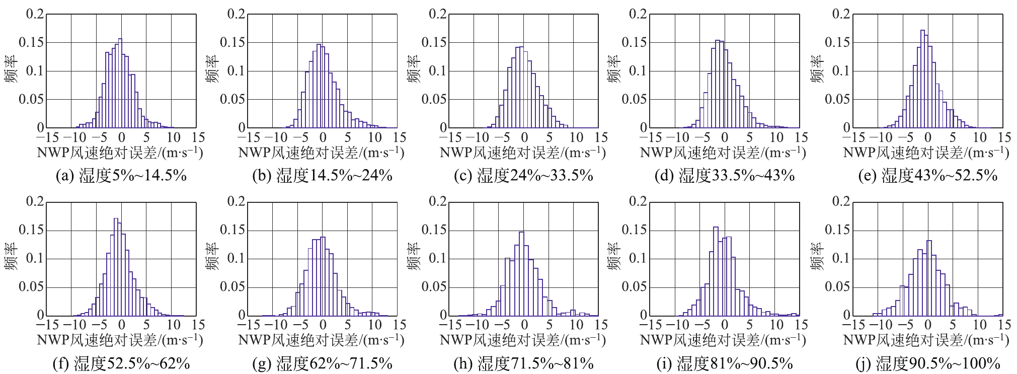 | 图6 不同湿度下NWP风速误差频率分布直方图 |