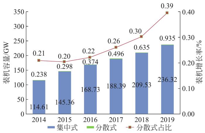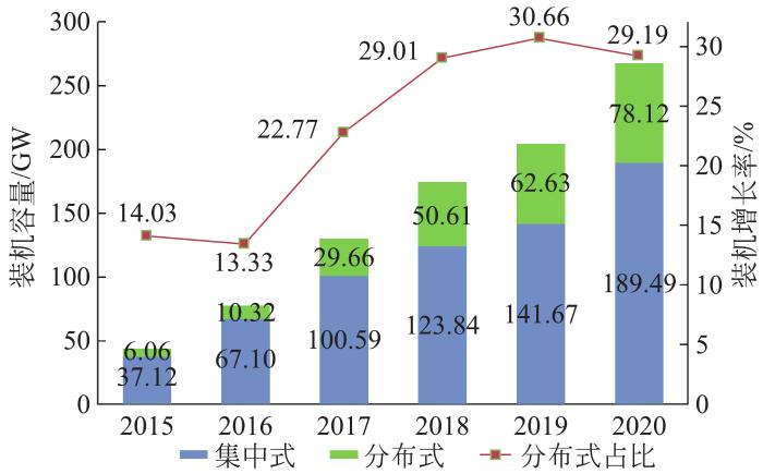 分布式光伏发电特指在用户场地或附近建设,运行方式以用户侧自发自用、多余电量上网,且单点并网总容量小于0.6×104 kW、具有配电系统平衡调节的光伏发电设施。通过整理国家能源局发布的光伏并网运行数据,2015—2020年我国集中式光伏装机容量和分布式光伏装机容量逐年增长,如图6所示。分布式光伏发电装机容量在全国光伏总装机容量中的占比逐年提升,近3年维持在30%左右,是我国发展运行最为成熟的分布式能源。