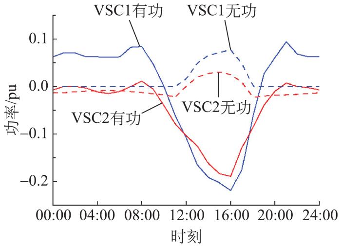 式中:Pref,k,t和Qref,k,t分别为VSC有功功率、无功功率整定值。在优化模型中,VSC的整定值Pref,k,t、Qref,k,t根据优化结果进行修正,实现对系统潮流的调控。