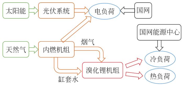 光伏发电设备几乎无需维护,其出力完全由天气情况决定,故后续运行成本中不考虑光伏系统的运行费用。光伏系统采用并网不上网的原则,由于屋顶光伏发电出力远小于大厦用电负荷,能被大厦自身用电负荷完全消纳;天然气为三联供的能源输入,进入内燃机组燃烧发电,利用烟气、缸套水余热进入溴化锂机组制冷或采暖,负荷不足部分由市电、能源中心进行补充。系统流程图如图1所示。