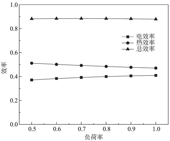 根据大厦燃气内燃机实际运行数据,可得电效率、热效率、总效率与电负荷率的变化关系,如图2所示。