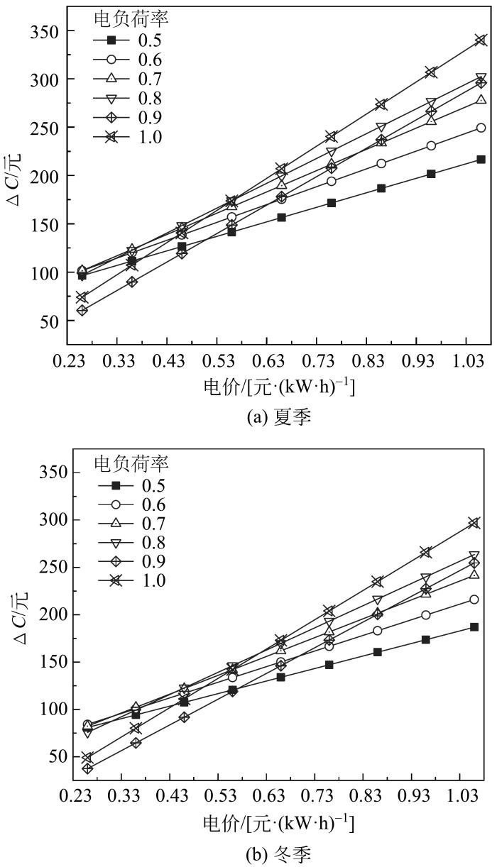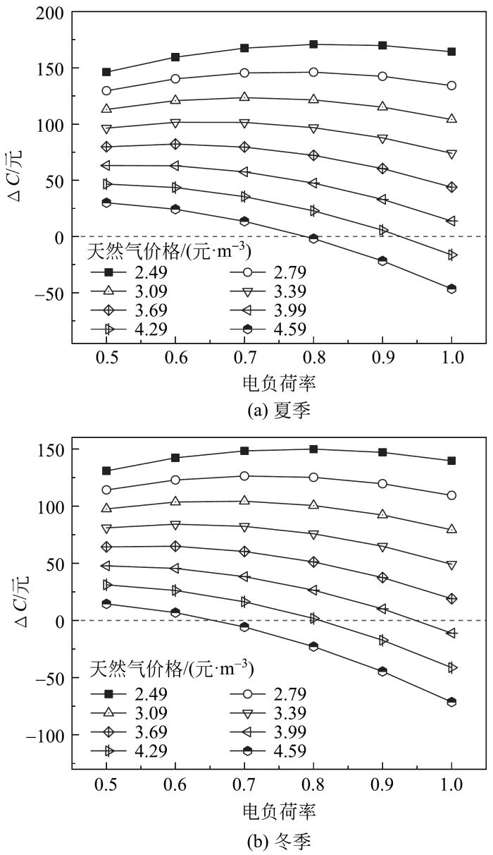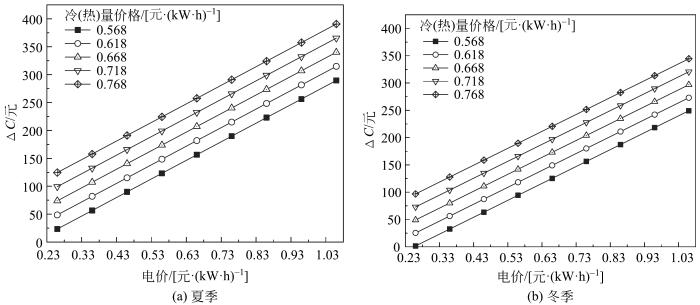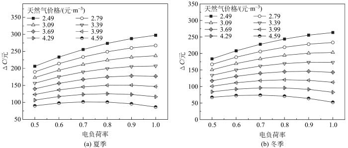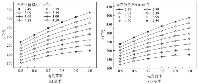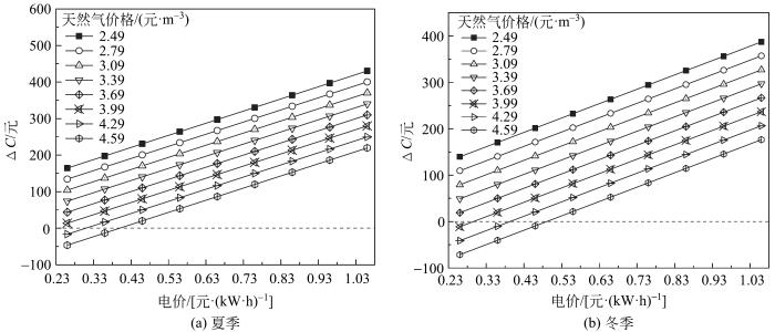 (2)三联供系统运行需综合考虑天然气和电网售电价格的影响:低谷电价时段冬、夏季天然气价格分别高于3.69和3.99元/m3时,直接购买冷热电比三联供系统运行费用更低。
