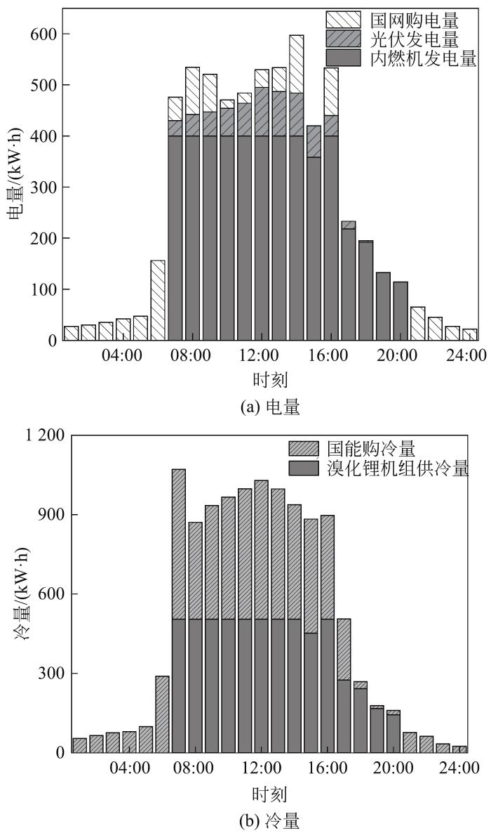 由图11可知,夏季以系统运行费用最小为优化目标时,在15:00,由于优先消纳光伏发电量,故内燃机降低负荷进行发电,在17:00—20:00,内燃机部分负荷发电,三联供产生冷量不足以满足所需冷负荷,需要从能源中心购买冷量,系统采用以电定热的运行方式。夜间阶段,由于电价较低且负荷不满足需求,故直接向国网及其能源中心购买冷量及电量。