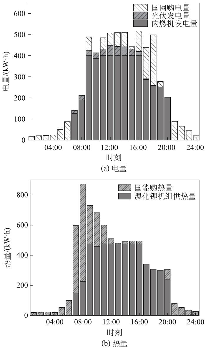 以系统综合运行费用最小为优化目标对燃气三联供耦合光伏系统的运行策略进行确定,优化过程中不同能源单价按照前文所述进行计算。夏季典型日负荷工况下系统运行策略如图11所示。