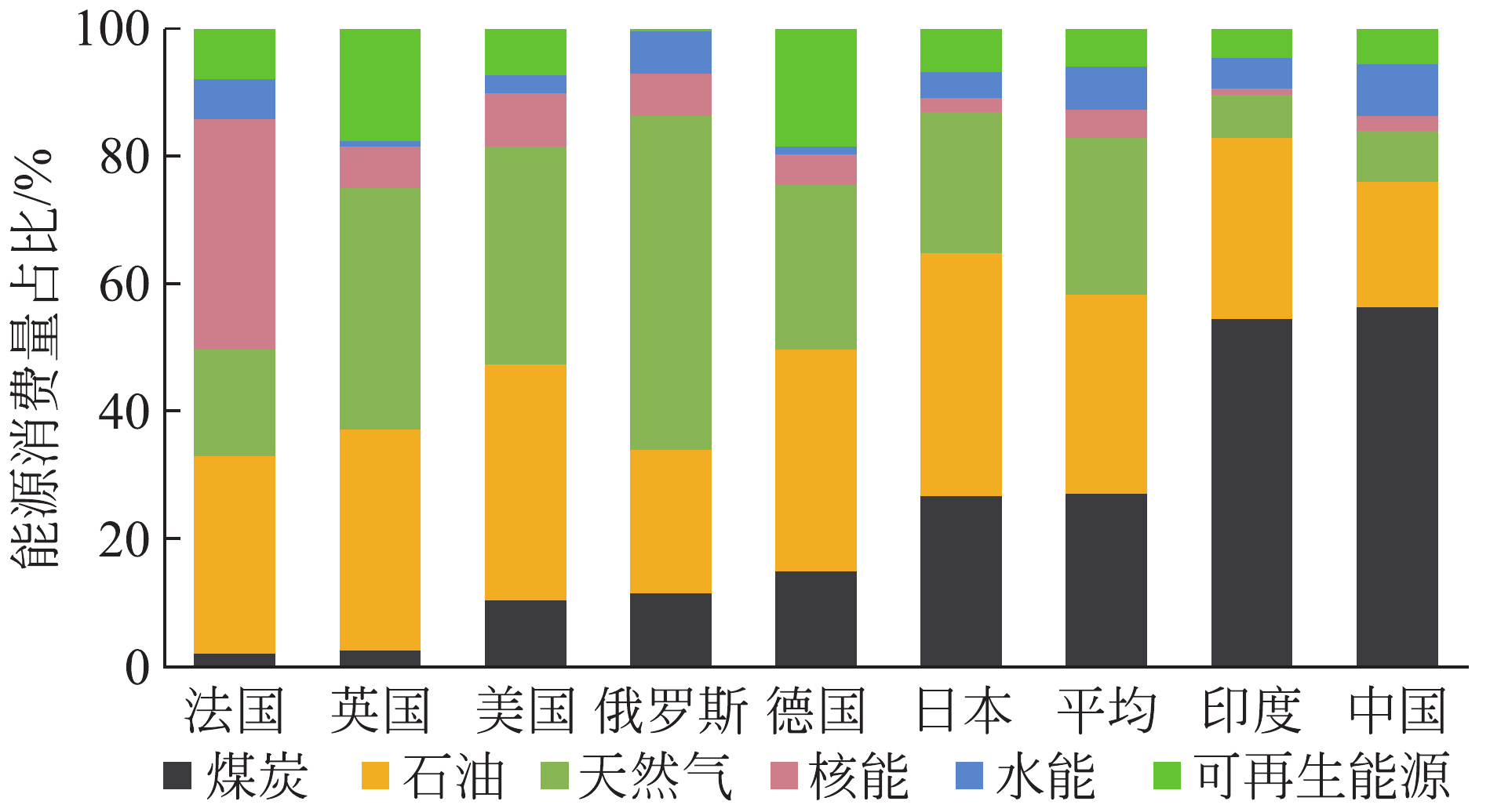 | 图3 2020年全球八大国家能源消费结构 Fig.3 Energy consumption structure of eight countries in the world in 2020 |