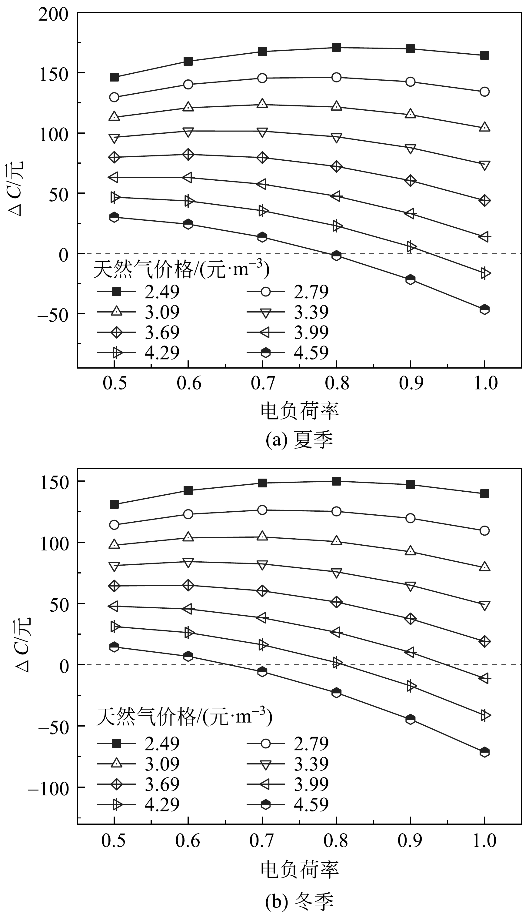 | 图7 低峰电价时费用差值随电负荷率和天然气价格变化曲线 |