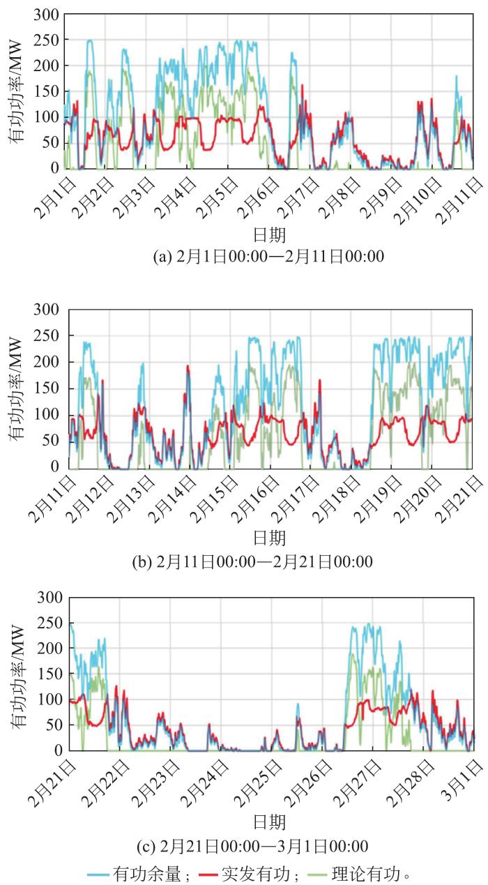 风电场A装机容量为250 MW,该风电场2021年2月实际发电量3 584.89万kW·h,因限电损失电量1 329.52万kW·h。根据机组历史运行数据分析,风电场A在2021年2月理论应发电量为6 478.12万kW·h,排除设备停运损失电量13.29万kW·h,限电损失电量总计2 879.94万kW·h。2月风电场A有效风时数486.3 h,全月限电约267 h,限电时段占有效风时数的54.8%。根据对风电场理论有功功率的测算,结合现场提供的限电记录综合分析,风电场A在2月份全月限电情况较为严重,体现在以下3个维度: