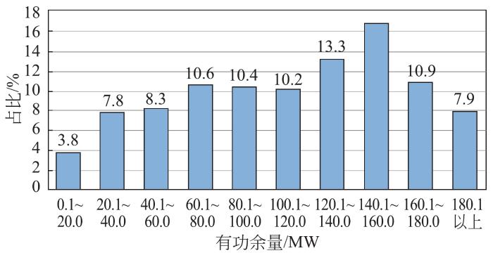 有功余量总体分布如图2所示,可见:限电期间的有功余量(受限有功)平均7.05万kW,部分时段近20万kW,2万kW以上的时段约257 h,占全部限电时段的96%。