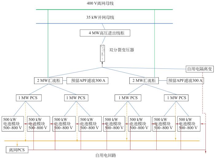 为提高系统集成度,将升压逆变合二为一,每4 MW PCS逆变升压单元包括4台1 MW储能PCS,每4台PCS接入1台升压变压器。全站配置5套4 MW储能PCS逆变升压一体化汇流单元。图6为4 MW储能PCS逆变升压单元拓扑图。
