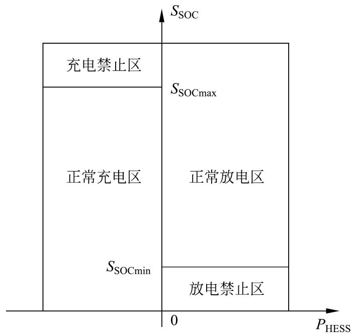 传统的能量管理策略如图3所示。在第1象限时PHESS>0,表示放电;在第2象限时PHESS<0,表示充电。充电时如果储能单元的SOC高于设置的最大值SSOCmax,则禁止充电;放电时如果储能单元的SOC低于设置的最小值SSOCmin,则禁止放电,以此来避免储能单元发生过充过放的现象。但是超级电容容量小,若采用传统能量管理策略,超级电容的SOC极易达到充电禁止区或放电禁止区,这会严重影响超级电容的可用性,进而导致功率出现剧烈波动,影响系统的稳定运行。因此采用传统的能量管理策略并不合适。