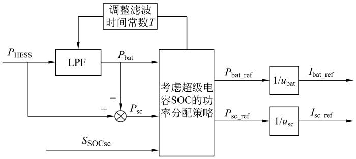 本文提出的考虑超级电容SOC的功率分配策略,先根据超级电容器的SOC划分5个不同区域,之后引入超级电容器SOC反馈,动态调整滤波时间常数T,以此来调整蓄电池和超级电容各自承担的功率。混合储能系统整体控制结构如图5所示,图中:SSOCsc为超级电容的荷电状态值;ubat、usc分别为蓄电池和超级电容的端电压值;Ibat_ref、Isc_ref分别为蓄电池和超级电容的电流参考值。