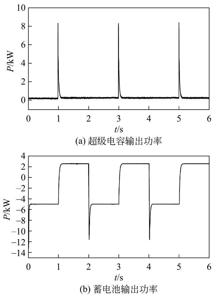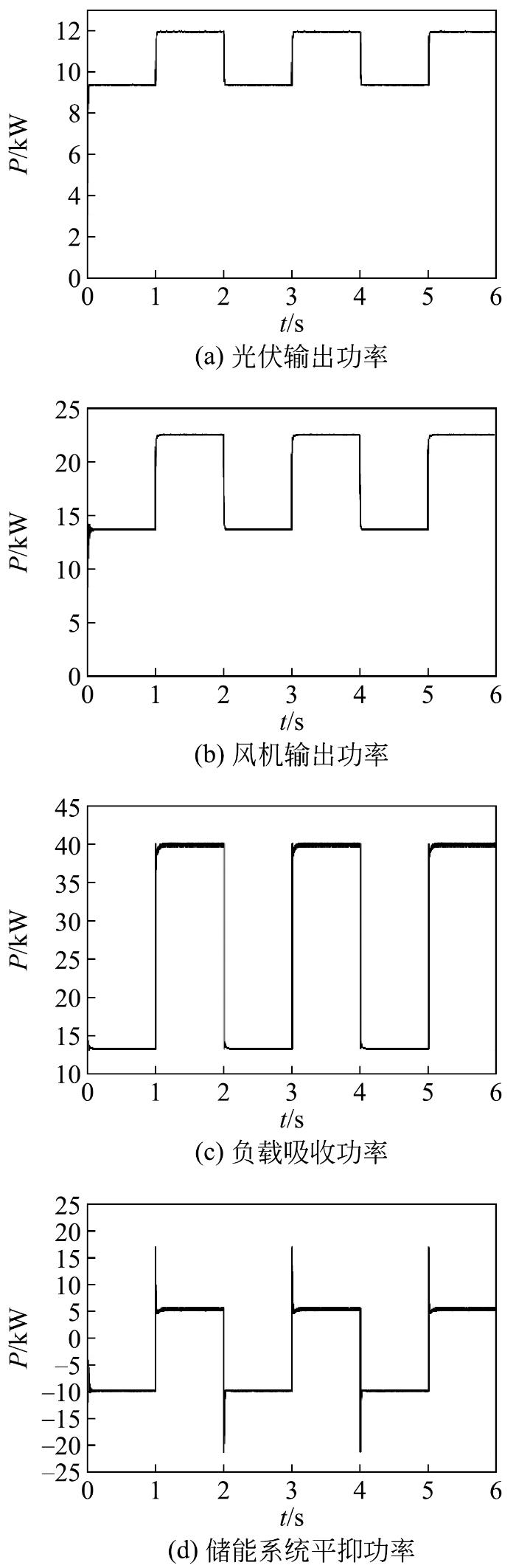 如图10所示,在仿真过程中,当功率出现突增或突减时,超级电容能快速反应来平抑功率波动,而蓄电池功率变化较为缓慢,当超级电容功率降为0时,蓄电池输出功率达到稳定,以此实现整个系统的功率平衡,体现了混合储能系统的优势。