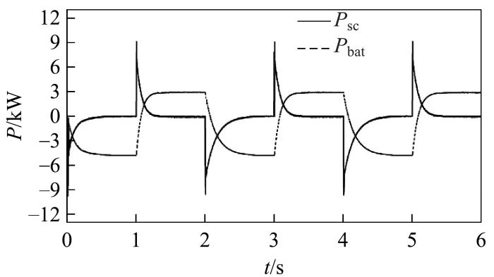 调整超级电容端电压,使其SOC的初始值位于充电禁止区。在整个仿真过程中,超级电容和蓄电池的功率变化情况如图17所示。对1个周期进行分析:在0~1 s时,系统功率过剩,需要混合储能系统充电来维持功率平衡,由于超级电容位于充电禁止区,不参与工作,其输出功率为0,因此蓄电池承担全部功率;1 s时负载功率突增,需要混合储能系统放电来维持功率平衡,此时超级电容快速放电平抑功率波动,当超级电容功率降为0时,蓄电池输出功率达到稳定,以此实现整个系统的功率平衡。