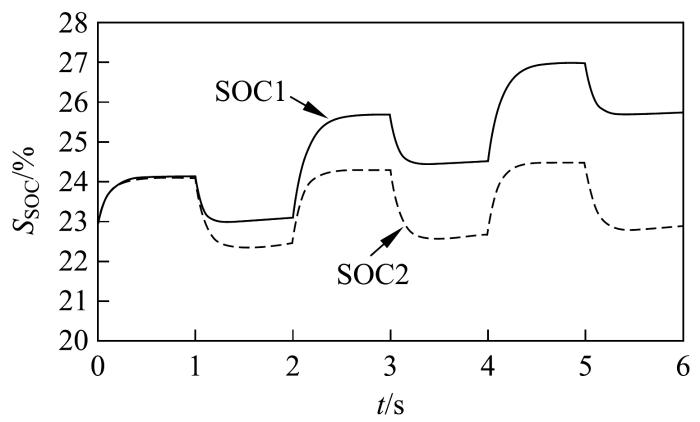 在整个仿真过程中,超级电容和蓄电池的SOC变化情况如图11、图12所示,图中:SOC1表示采用本文所提控制策略的SOC变化情况,而SOC2表示采用传统低通滤波法的SOC变化情况。由图11可知,此时超级电容工作在放电警戒区。超级电容SOC的初始值为23%,采用传统低通滤波法时,其充放电功率大致相等,因此SOC的上升和下降值基本相等,在仿真结束时SOC值为22.8%,超级电容不具有SOC自恢复能力。采用本文所提控制策略时,超级电容充电速度明显高于放电速度,因此其SOC上升多、下降少,在仿真结束时SOC值为25.7%,这表明本文所提控制策略能使超级电容具有SOC自恢复能力。图12中SOC1明显低于SOC2,这表明在系统工作过程中,采用本文所提的控制策略,蓄电池吸收了更少的功率,而超级电容吸收了更多功率,促进其SOC尽快恢复至正常工作区。
