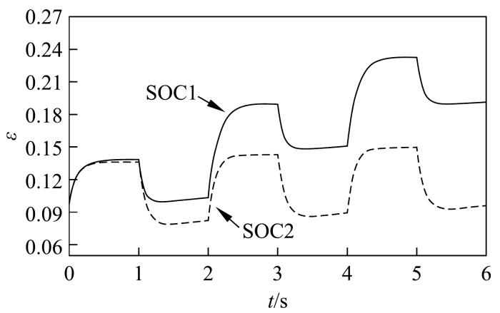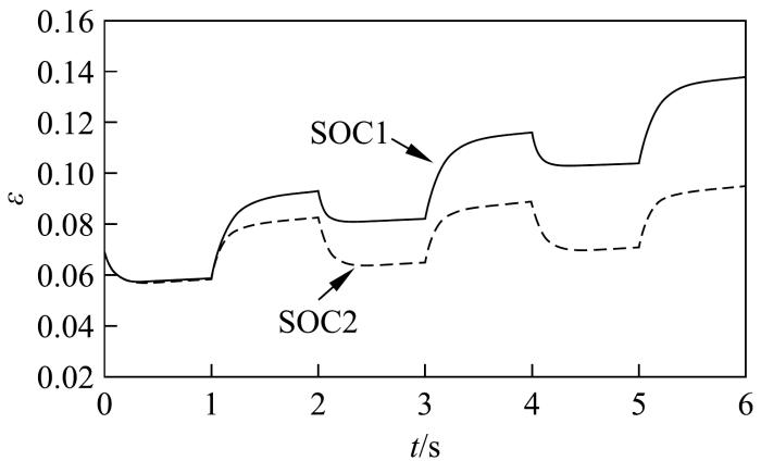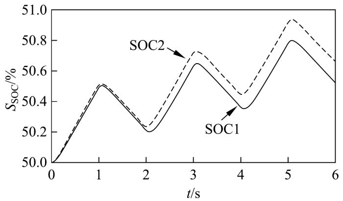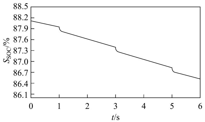 图9为放电禁止区超级电容SOC变化波形图。由于在该区域,超级电容禁止放电,其SOC没有下降的趋势。在2和4 s时由于超级电容快速响应吸收功率波动,其SOC上升。这表明本文所提控制策略可有效防止超级电容过放,促进其SOC尽快恢复至正常工作区。