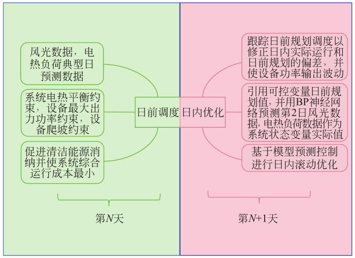 日前的经济调度为一次寻优,风光数据和电、热负荷为逐时数据,如果直接执行日前的规划调度,可能会产生电热能供需不平。因此需要将日内的可调控设备的功率输出及时调整,使系统调度时既满足供需平衡,又兼顾经济节能性。