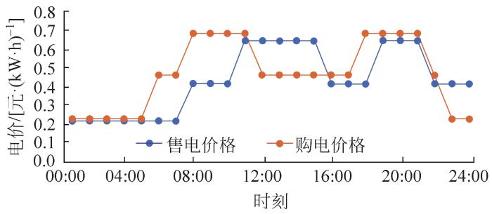 式中:CBuy(t)为t时刻从电网购电价格,PBuy(t)为t时刻从电网购电功率;CSell(t)为t时刻向电网售电价格;PSell(t)为t时刻向电网售电功率。