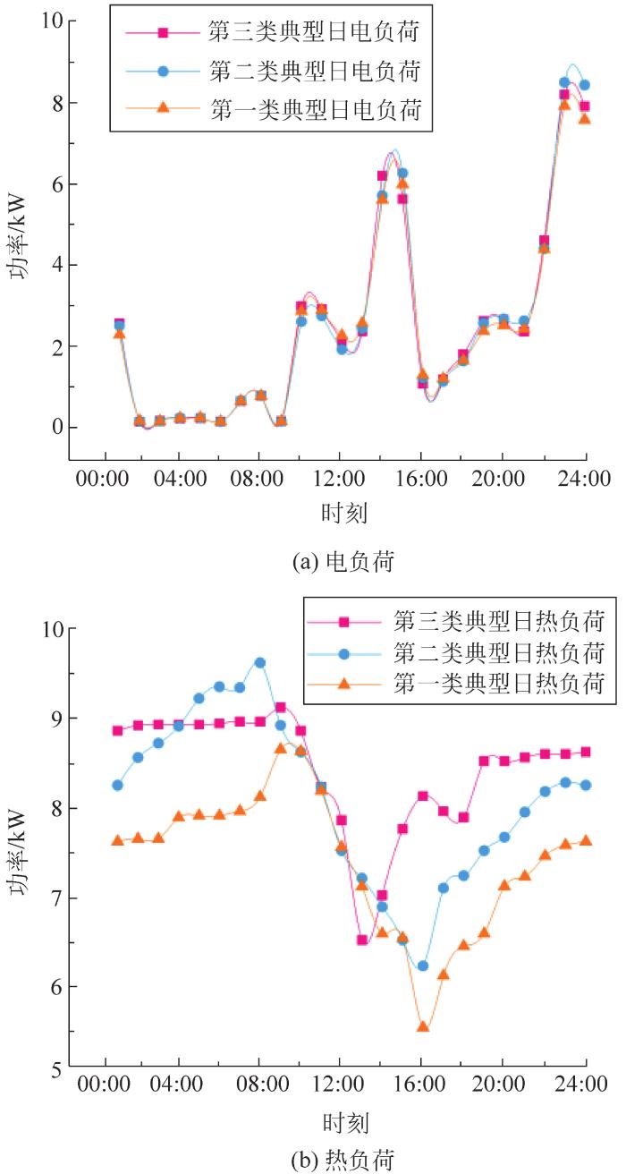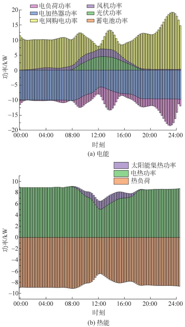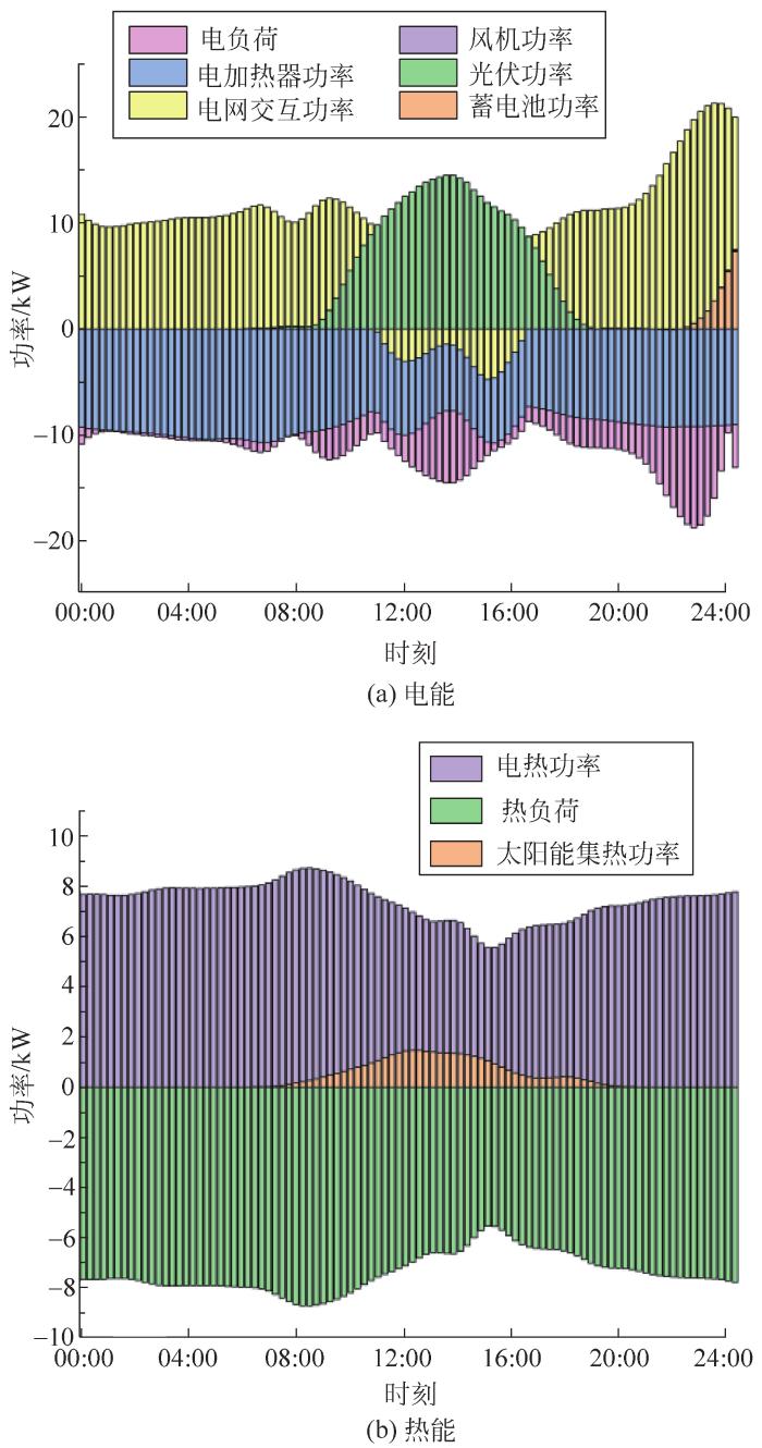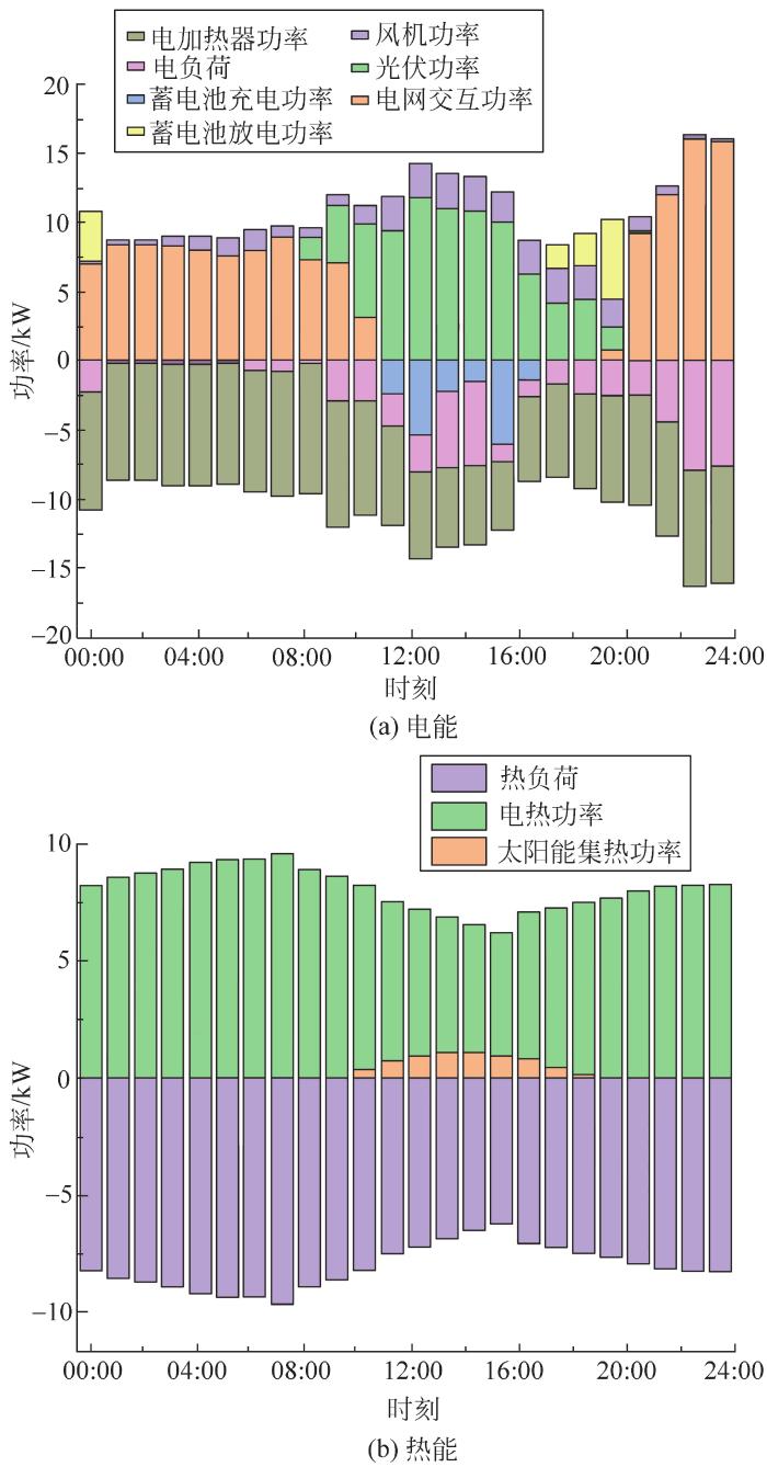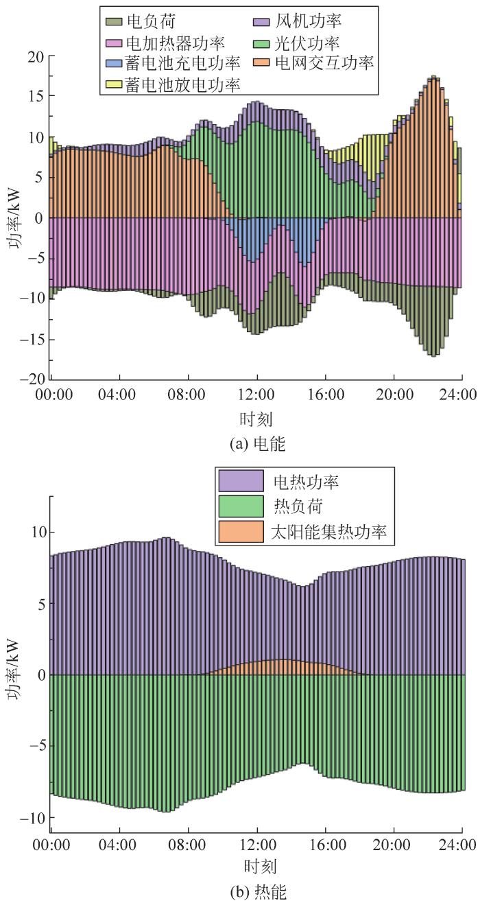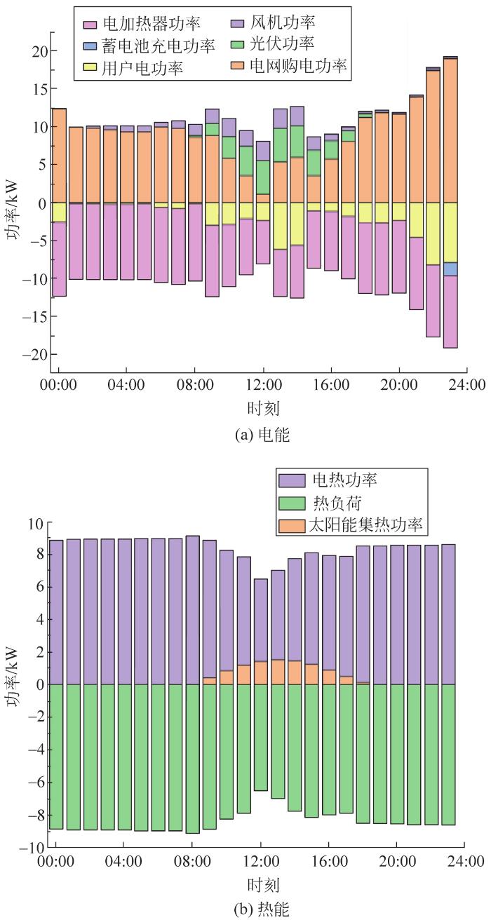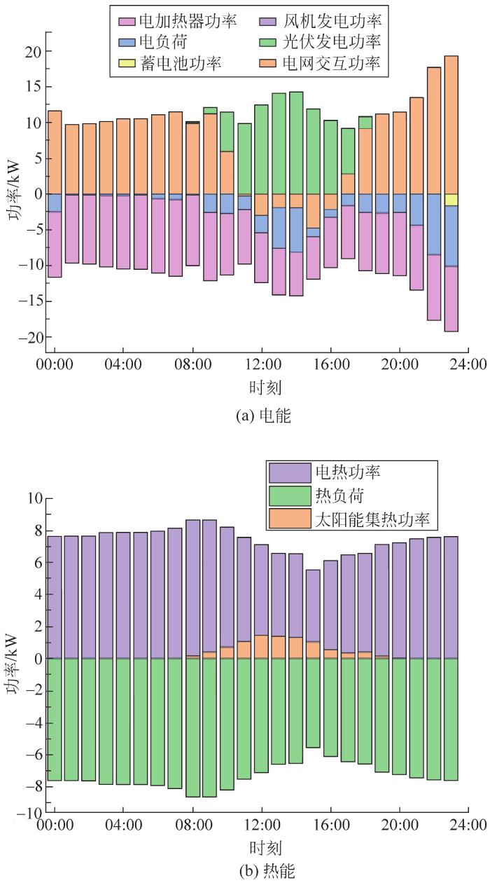 从图7可看出:有风但光照弱条件下,在00:00—08:00时段,光伏发电和太阳能集热器出力为0;风力发电弱,无法满足电热负荷需求,因此需向电网购电。09:00—17:00时段,光伏发电小,尽管风机以最大功率运行,仍要向电网购电,太阳能集热器和电加热协同满足用户热负荷需求。在18:00—23:00时段,电网满足电负荷需求,电加热器满足热负荷需求。