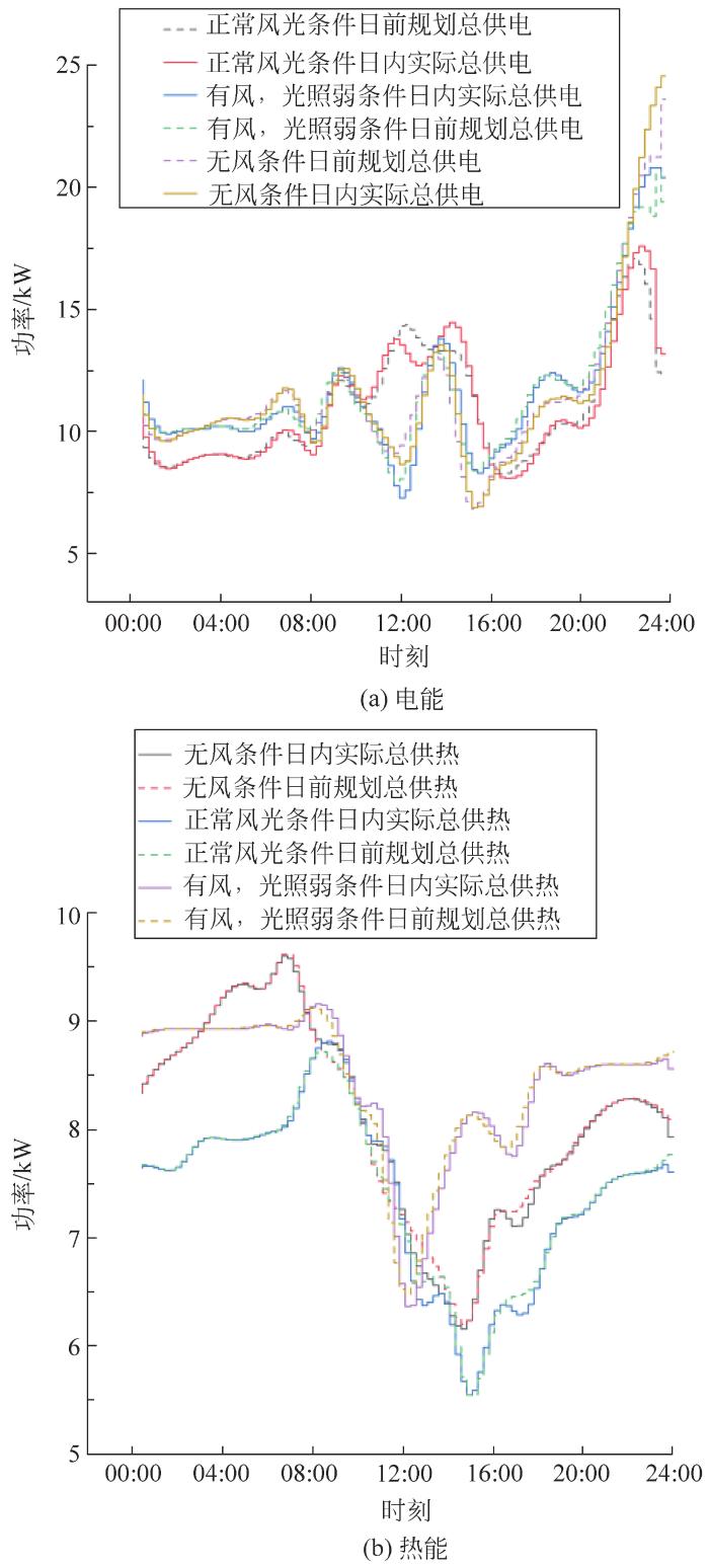 由风机发电、光伏发电、蓄电池放电功率、电网交互功率之和作为系统日总供电。将太阳能集热器功率和电加热器功率之和作为日总供热。由日前规划和日内滚动优化得出各典型日MPC电能和热能追踪结果如图11所示。
