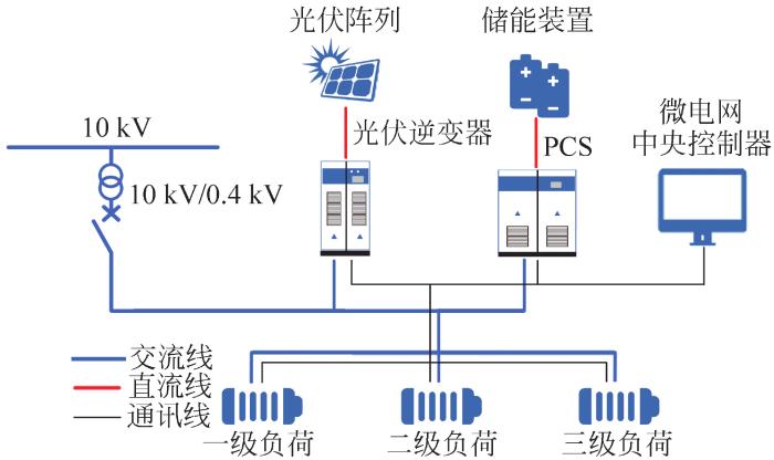 本研究所描述的微电网系统拓扑图如图1所示。微电网是由分布式光伏系统、储能系统、控制系统和相关负荷等汇集而成的小型发配电系统,可为区域内负荷供电,利用储能装置和控制保护装置实时调节以平滑系统的波动,维持网络内部的发电和负荷的平衡,保证电压和频率的稳定,是一个能实现自我控制、保护和管理的自治系统。