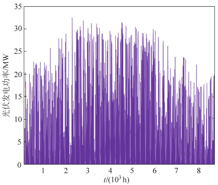 利用微电网优化模型,依据全年光伏发电曲线及负载功率曲线,进行仿真分析。园区光伏装机容量遵循“应铺尽铺”的原则,光伏系统最大铺设装机容量为40 MW,以式(