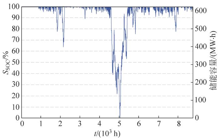 式中:ηc为储能系统充电效率;PBESS为储能系统额定功率;EBESS为储能系统额定容量;SSOC(t)为t时刻储能系统荷电状态;Δt为该运行阶段的运行时常;SSOCmax为储能系统荷电状态最大值。