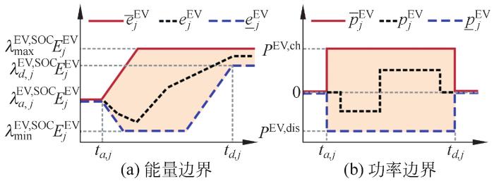 EV规模庞大,集中式调度模式下计算负担增重,大大降低车网互动效率,因此电动汽车聚合商(electric vehicle aggregator, EVA)应运而生。EVA通过收集到的各单体EV充电行为信息,基于能量、功率边界模型生成其可调区域,进而直接叠加各EV的边界值即可获得大规模EV的整体可调容量,EV聚合可调容量模型为