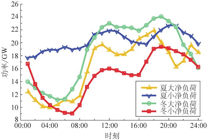 由图2可看出:2025年各场景下的净负荷曲线调峰需求都有不同特点。夏大场景下的调峰需求波动范围广(10~22 GW),在08:00—09:00、09:00—10:00这2个时段的短时爬坡需求大。夏小场景下的调峰需求波动范围相较夏大运行方式有所减小,但在09:00—10:00这个时段的短时爬坡需求仍较大。冬大和冬小场景下的调峰需求波动范围广,冬大场景下在08:00—09:00这个时段的短时爬坡需求仍较大,冬小场景下在01:00—02:00、08:00—09:00这2个时段的爬坡需求较大。因此,在各个场景要实现新能源更高消纳率,储能、火电机组等调峰资源容量、爬坡特性要充分满足净负荷曲线调峰需求。