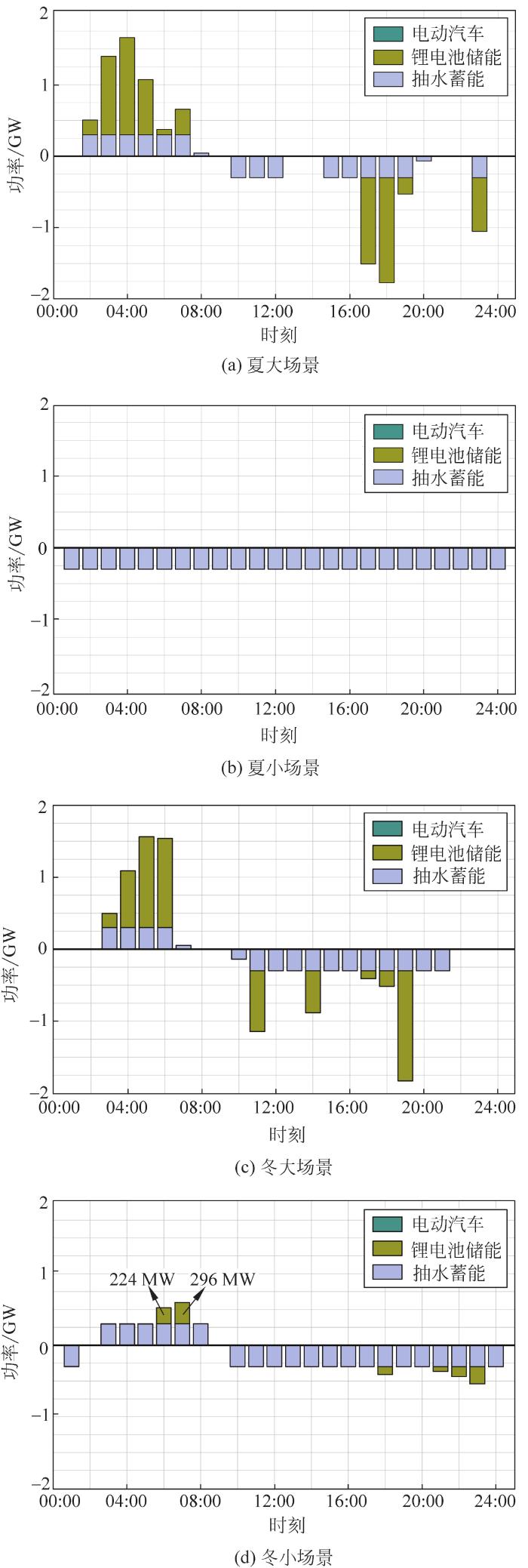 (4)冬小运行方式下,所需调峰容量相对其他3个场景较小,夜间在净负荷最小的2个时段调用抽蓄满抽,此外还需额外调用锂电池储能250 MW左右的充电功率即可。由于EV虚拟储能的调峰成本最昂贵,在火电机组、抽水蓄能、电池储能能够满足调峰需求的情况下,4个典型场景均没有调用EV虚拟储能参与调峰,原因在于EV调峰成本过高,其调峰调用优先级较低,间接验证了模型的经济性。