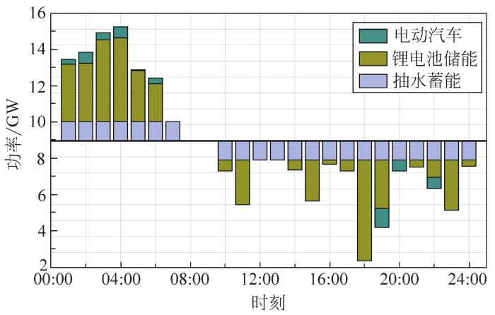(1)夏大场景下,抽水蓄能在夜间处于满抽工况,尽可能地填补可能出现的下调缺口,但在净负荷曲线下凹时段可以不发。锂电池的出力柱形图基本与净负荷曲线互补,净负荷越小储能充电功率越大,有将净负荷曲线低谷“填平”的趋势。