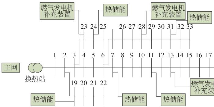 选取某工业园区冬季供暖日作为算例,在指定环境系统下,通过本文设计的基于考虑节点拓扑和负荷不确定性的配电网源网荷储分层协调控制方法进行仿真实验。算例设计节点分布如图3所示。