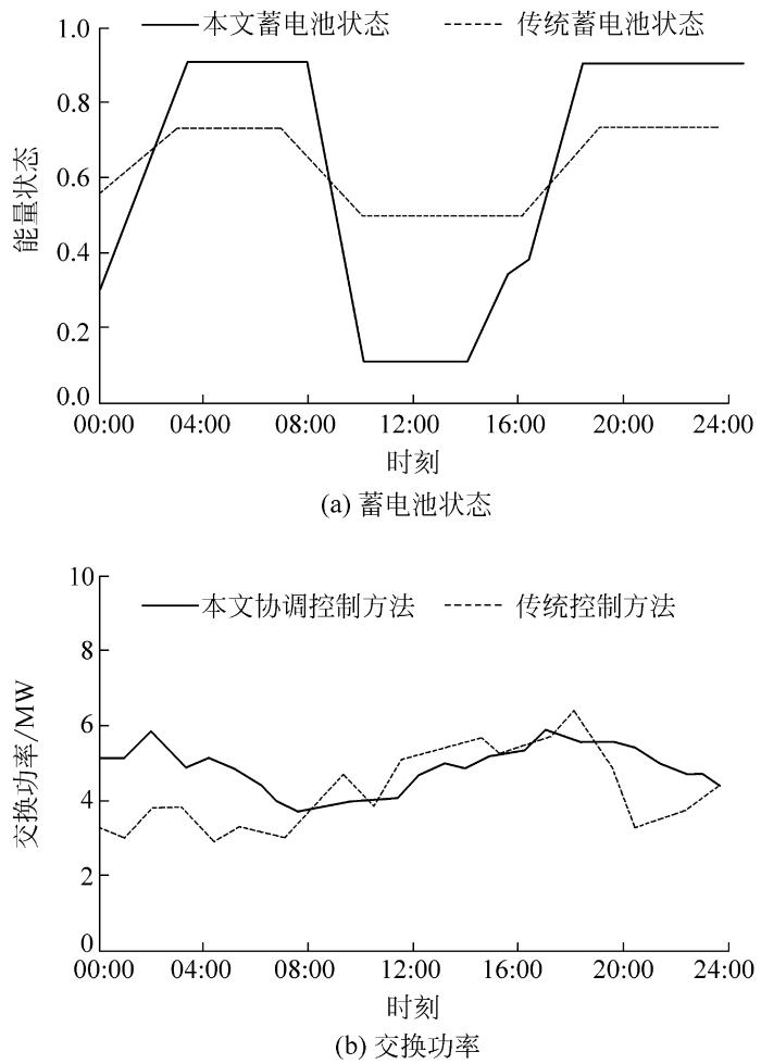 由图7可看出:00:00—05:00时对于电负电荷需求率保持在较低状态,此时蓄电池进行电量补充;在07:00充电完成;08:00—12:00供热功率上升,蓄电池为放电状态;13:00—19:00为电量补充时间;20:00—24:00充电完成。本文设计的协调控制方法较传统方法蓄电池的能量状态更好,交换功率更高,更稳定,且会根据实际需求进行自适应调整,可以更好的满足功率需求。